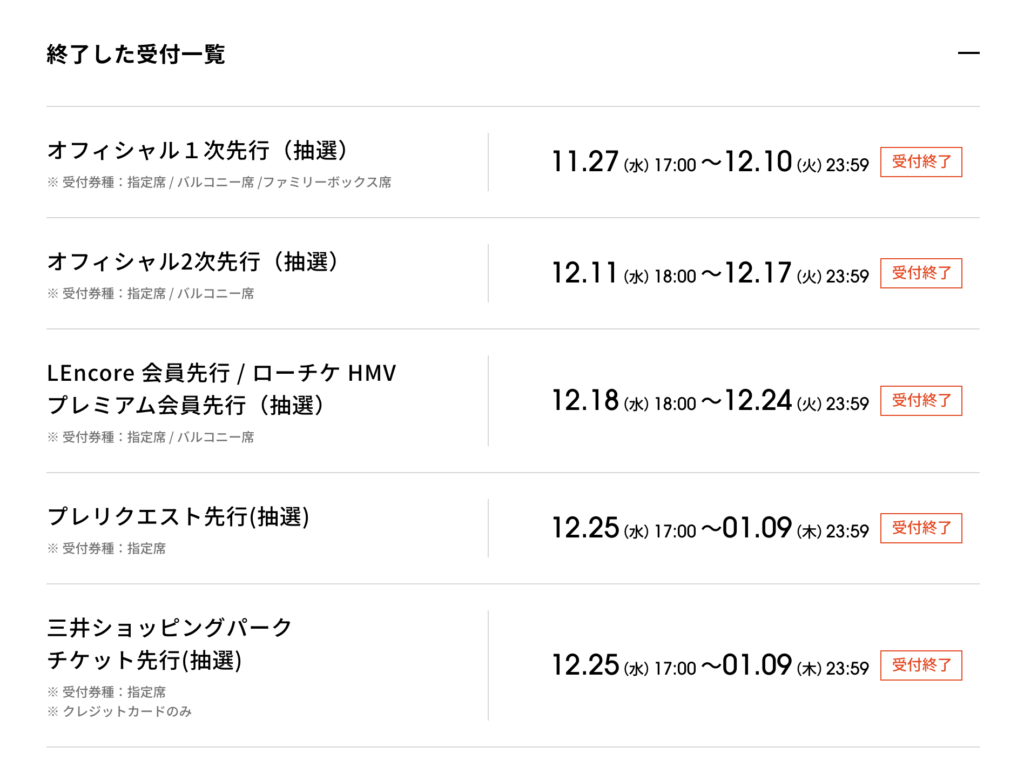 「LEncore会員2次先行(抽選) / ローチケHMVプレミアム2次会員先行(抽選)」、「プレリクエスト2次先行(抽選)」の受付が始まっています。